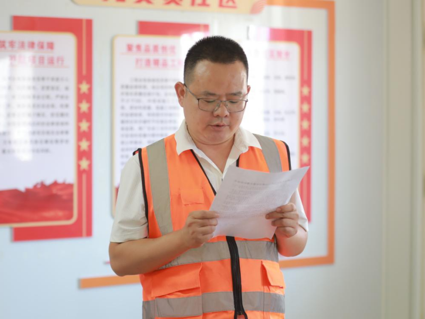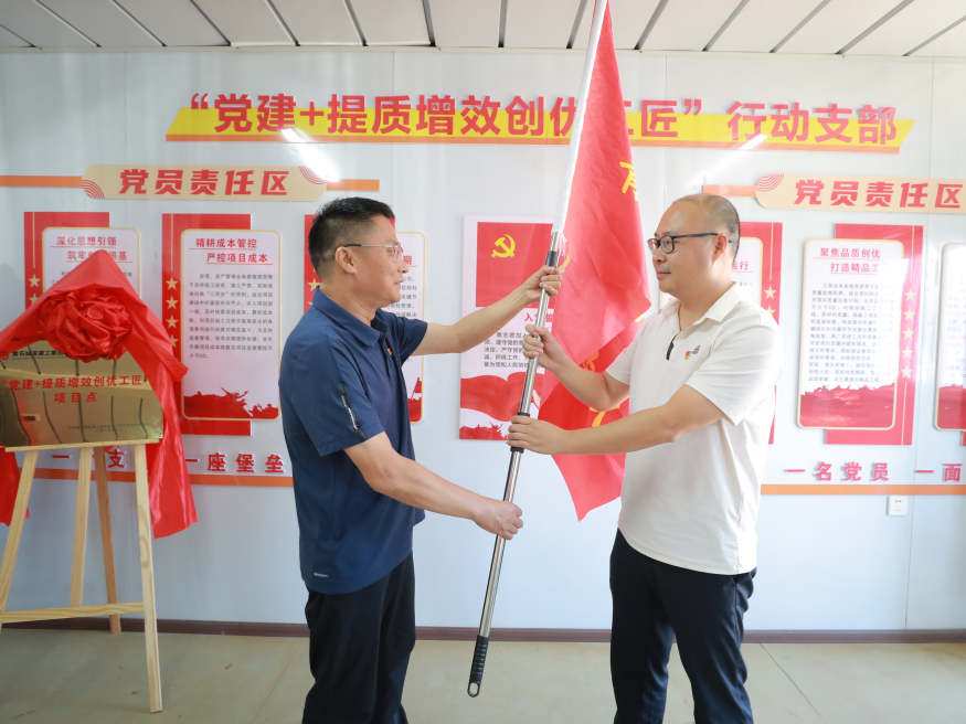 隨后,建工集團(tuán)機(jī)關(guān)黨支部開(kāi)展“能工巧匠”黨建品牌活動(dòng),學(xué)習(xí)宣貫了清廉項(xiàng)目清風(fēng)工匠行動(dòng)、青年突擊攻堅(jiān)工匠行動(dòng)和提質(zhì)增效創(chuàng)優(yōu)工匠行動(dòng)實(shí)施方案。王鵬同志帶領(lǐng)全體黨員宣讀了廉潔從業(yè)誓詞,崔巍同志和呂成芳同志分別為項(xiàng)目廉潔監(jiān)督員頒發(fā)聘書(shū),廉潔監(jiān)督員代表作了履職承諾。建工集團(tuán)機(jī)關(guān)支部舉行了“建工集團(tuán)青年先鋒突擊隊(duì)”授旗儀式,洪登峰同志將隊(duì)旗授予青年先鋒突擊隊(duì)隊(duì)長(zhǎng)。最后全體黨員按照黨員責(zé)任區(qū)分工檢查了項(xiàng)目安全、進(jìn)度、質(zhì)量、經(jīng)營(yíng)、物資管理、法律風(fēng)險(xiǎn)的情況,并與項(xiàng)目部深入交流,提出改進(jìn)措施和意見(jiàn)。